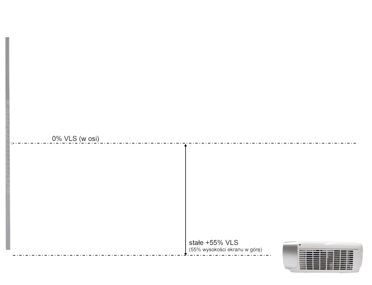 Jak zatem widzimy, optyka projektora wprowadza dosyć spore ograniczenia w instalacji, jeśli chcemy uzyskać optymalny efekt to urządzenie musi być wyśrodkowane względem ekranu i musi znajdować się nieznacznie powyżej górnej lub poniżej dolnej krawędzi ekranu. W przeciwnym razie, by wcelować obrazem w docelowe miejsce, konieczne będzie przekrzywienie projektora i obraz przyjmie kształt trapezoidalny. Producent przewidział bogate możliwości korekcji takiego zniekształcenia, więc suma summarum będzie możliwy i taki układ. Należy pamiętać jednak, że używanie korekcji trapezowej (tzw. keystone) zmniejsza rozdzielczość obrazu i powoduje rozmycie krawędzi, zatem starajmy się dołożyć wszelkich starań by wcelować w ekran za pomocą doboru optymalnego wieszaka.