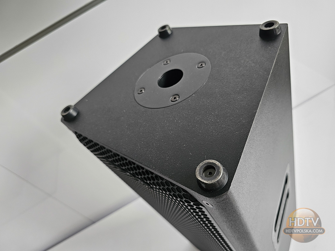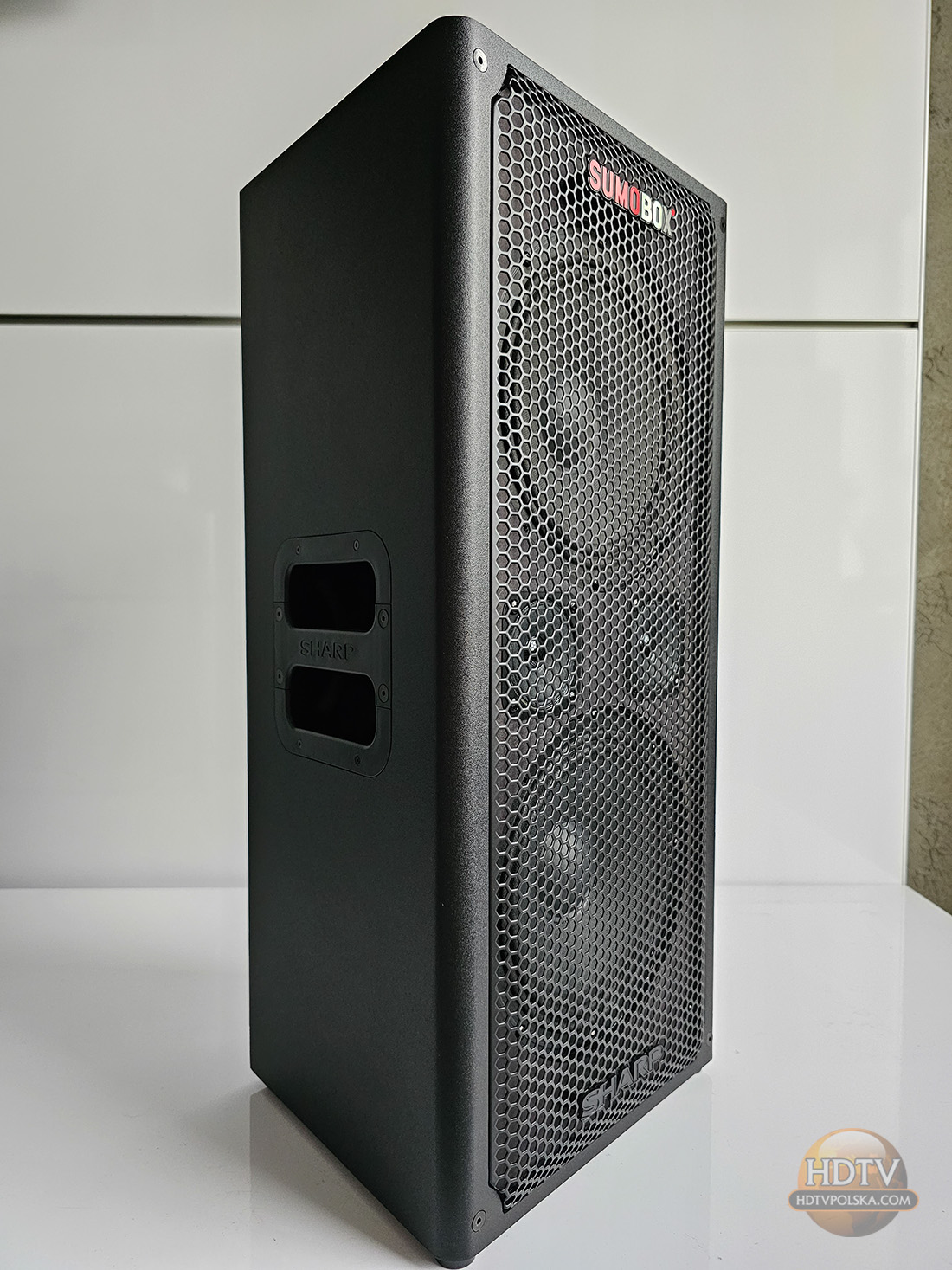 Pod względem estetycznym SumoBox jest funkcjonalny i imponujący dzięki przemysłowej, stalowej czarnej kratce zwanej potocznie grillem, zabezpieczającej przetworniki w masywnej konstrukcji. W zestawie znajdują się silikonowe ochraniacze narożników, które chronią głośnik podczas transportu i umożliwiają używanie głośnika jako monitora na boku. Ponieważ w orientacji poziomej i pionowej znajdują się trzy uchwyty, przenoszenie lub ustawienie w pozycji pionowej lub poziomej głośnika Bluetooth nie będzie zbyt kłopotliwe. Na spodzie obudowy mamy znormalizowane 35 mm gniazdo montażowe do stojaka głośnikowego, dzięki któremu można zamontować CP-LS100 na uchwycie w celu uzyskania jeszcze lepszego pokrycia dźwiękiem. Stojak musi utrzymać głośnik o minimalnej masie 25 kg. Podczas korzystania ze stojaka opcjonalne zaokrąglone zabezpieczenia narożników można usunąć za pomocą dostarczonego w zestawie śrubokręta.