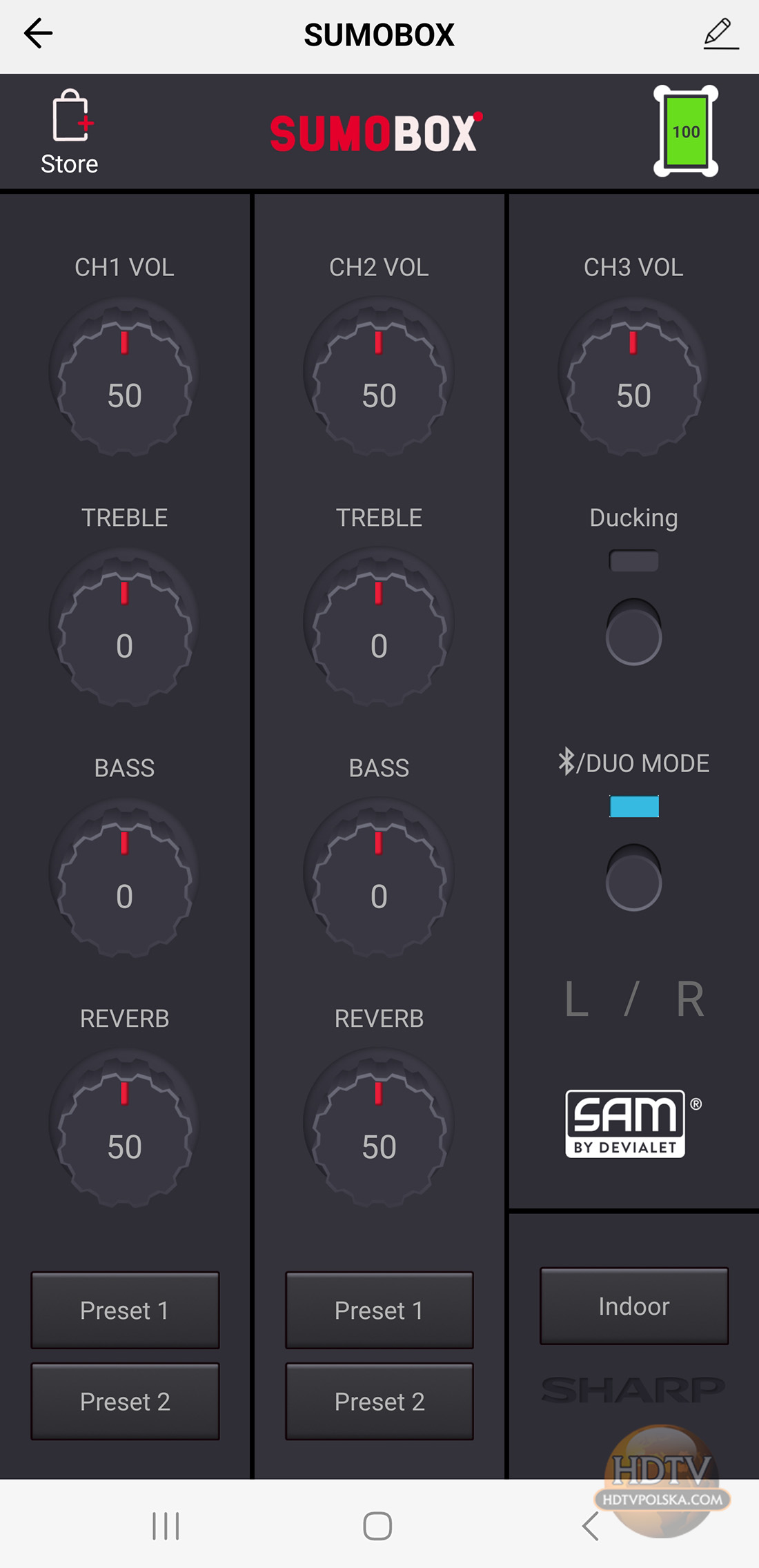Sharp CP-LS100 ma wbudowany selektor instrumentów, które możemy do niego podłączyć, a są nimi keyboard, gitara lub mikrofon. Nie zabrakło prostego equalizera w postaci przełącznika na obudowie. Mamy dwa tryby do wyboru: Indoor, gdzie dźwięk jest zoptymalizowany do brzmienia wewnątrz pomieszczeń, oraz tryb Outdoor dedykowany na zewnątrz, gdzie wzmocnione są wysokie i średnie częstotliwości. Dzięki temu są one lepiej słyszalne na zewnątrz. Do dyspozycji mamy sprawnie przygotowaną aplikację na telefon Sharp Life, którą możemy sterować komfortowo SumoBox z dowolnego miejsca w pomieszczeniu.