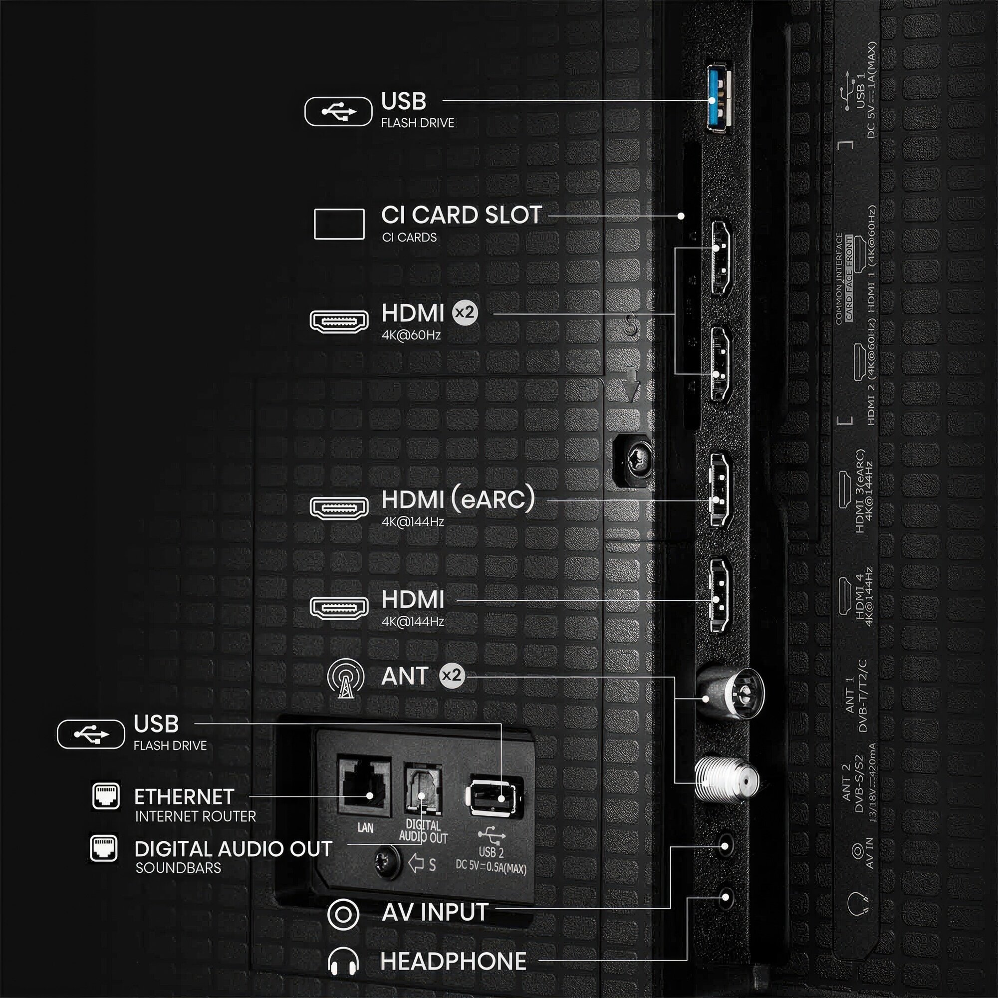 HISENSE E8Q ma być telewizorem „gotowym na rozrywkę”, więc w kwestii złącz trudno było sobie pozwolić na jakieś większe niedociągnięcia. Nie będziemy was zanudzać oczywistymi elementami w stylu CI+, USB, wyjście optyczne czy gniazdo sieciowe, bo to dziś standard. Najważniejsze pytanie brzmi raczej: ile jest portów HDMI 2.1 i czy w ogóle się tutaj znalazły. Odpowiedź jest prosta – tak, E8Q został wyposażony w cztery porty HDMI, z czego dwa obsługują standard 2.1 i pozwalają przesyłać obraz w 4K przy 144 Hz. To dobra wiadomość dla osób planujących podłączenie konsoli najnowszej generacji (choć już nie takiej nowej 😉) czy komputera do grania. Trochę szkoda, że nie zdecydowano się na cztery pełnoprawne HDMI 2.1, jak to miało miejsce w modelu U78Q Pro, bo wtedy mielibyśmy pełną swobodę w kwestii podłączania kilku urządzeń jednocześnie zwłaszcza, że jeden z portów 2.1 został przeznaczony pod eARC. Na plus można jednak zapisać obecność klasycznych złączy analogowych – znajdziemy tu wejście jack oraz AV input, które docenią osoby mające starsze kino domowe albo chcące podpiąć zwykłe słuchawki przewodowe.