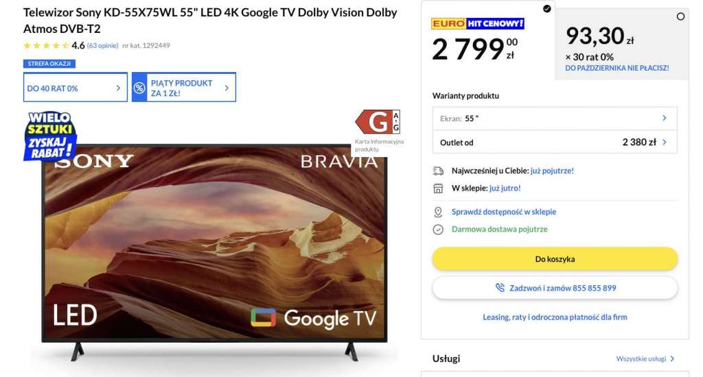 Obecnie w RTV EURO AGD model o przekątnej 55 cali dostępny jest w promocyjnej cenie – tylko 2 799 zł! Dodatkowo, przy zakupie na raty, pierwszą płatność można przesunąć aż do października 2025!