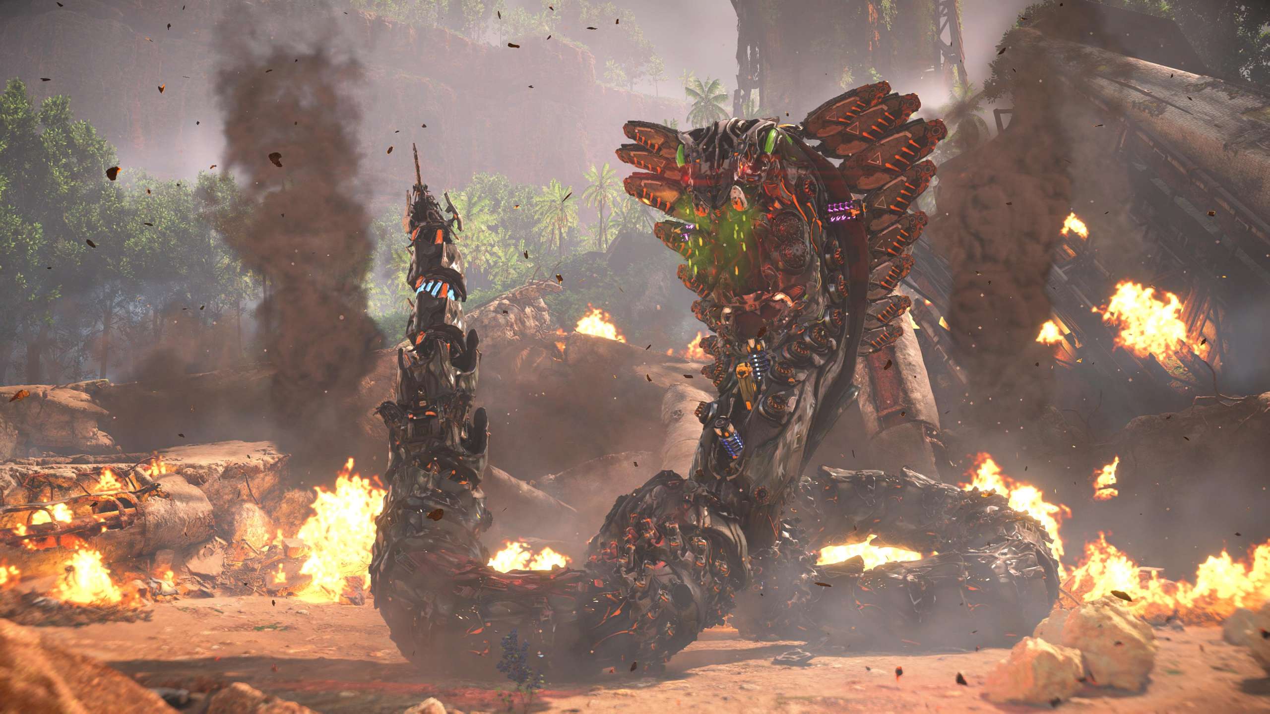 Dość już jednak narzekania na oprawę graficzną. W późniejszych fragmentach tekstu zwrócę jeszcze uwagę na kilka pomniejszych kłopotów, z którymi mierzy się Forbidden West, ale one wszystkie bledną w zestawieniu z tym, jaki ten tytuł prezentuje sobą poziom ogółem. Po przebrnięciu przez wspomniane początkowe etapy rozgrywki, świat gry otworzył przede mną wrota i wyruszyłem wraz z Aloy na południe. To w tym momencie Forbiden West zaczęło pokazywać prawdziwy graficzny pazur. Przepiękne, głębokie w treść krajobrazy, barwne bogactwo fauny i flory, dynamiczna pogoda i bardzo mocny nacisk na poziom detali na przykład w obrębie modeli wrogich maszyn – w końcu pojąłem, że niektórych rzeczy po prostu nie miałbym szans zobaczyć na PS4 i to w rozdzielczości 4K.
