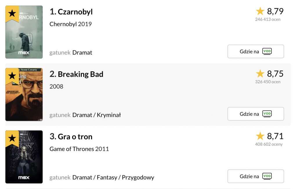 Tak prezentuje się czołowa dziesiątka najwyżej ocenianych przez Polaków seriali w serwisie Filmweb: