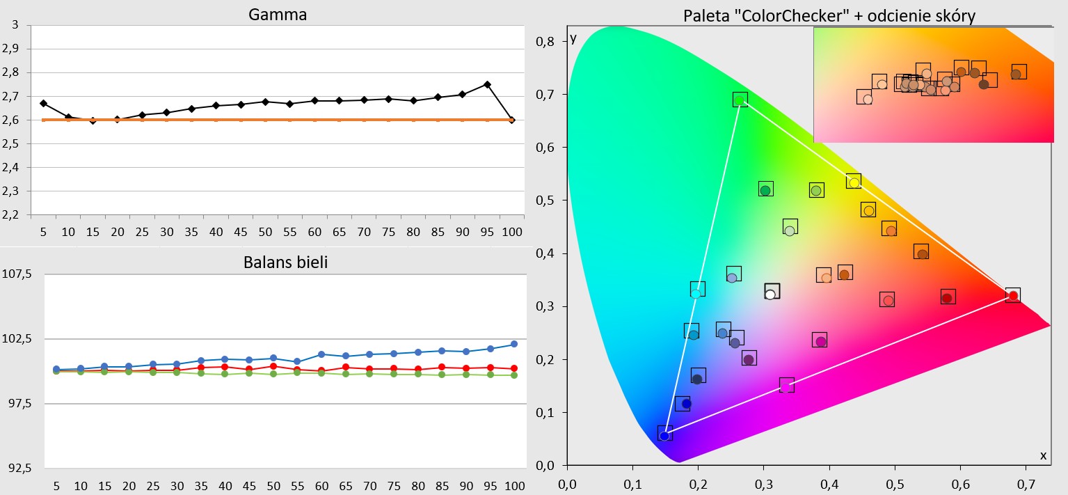 - Pokrycie szerokiej palety barw DCI-P3 na poziomie ok. 99% oraz BT.2020 na poziomie 78%