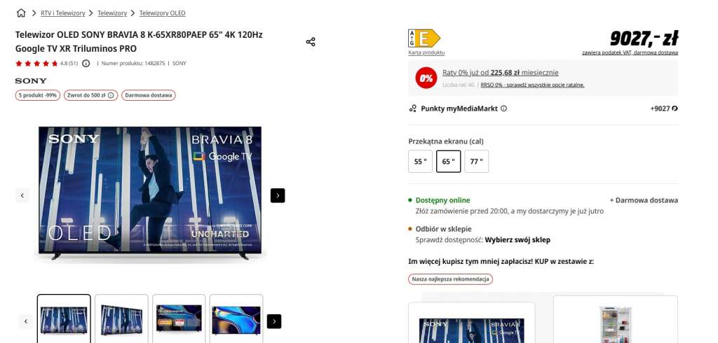 Hitowy OLED ze znakomitą jakością obrazu? W 2024 roku firma Sony wprowadziła trzy nowe serie telewizorów z rodziny BRAVIA: modele o symbolach 7, 8 i 9. Na tę chwilę jedną z najlepszych ofert na rynku znajdziesz w sklepie Media Markt, który właśnie uruchomił mega promocję na ten telewizor w rozmiarze 65 cali.