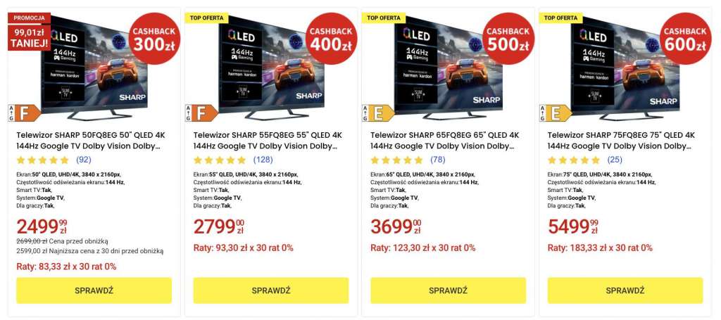 | Telewizor QLED SHARP GR8 50″ (2024) | SPRAWDŹ NAJNIŻSZĄ CENĘ (zwrot 200 zł) |