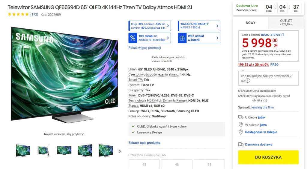 Obecnie wariant tego telewizora z atrakcyjnym ekranem 65 cali oferowany jest w bardzo przystępnej cenie – najniższej od premiery tego modelu! Do tego sieć Media Expert proponuje 30 rat 0% z dodatkową możliwością odroczenia momentu rozpoczęcia spłaty aż do końca 2025 roku!