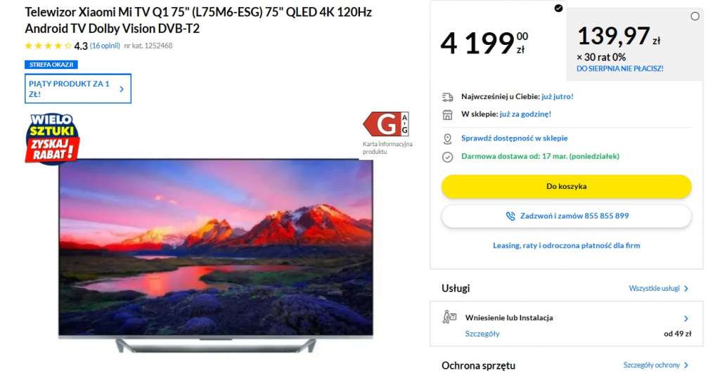 Sklep RTV EURO AGD właśnie obniżył cenę telewizor Xiaomi Mi TV Q1 o przekątnej 75 cali, który możemy kupić już za 4 199 zł. Dodatkowo możemy skorzystać z aż 30 rat 0% z odroczeniem płatności aż do sierpnia 2025 roku!