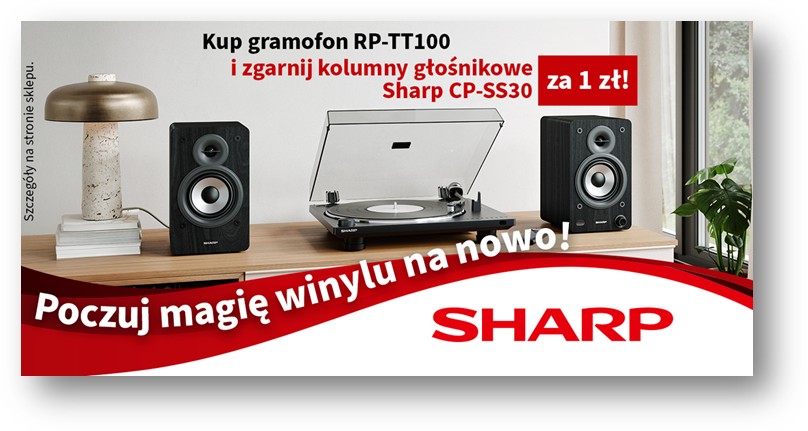 Miłośnicy klasycznego brzmienia mogą skorzystać z wyjątkowej oferty na elegancki gramofon Sharp RP-TT100. Przy jego zakupie u wybranych partnerów handlowych, klienci mogą dokupić kolumny głośnikowe Sharp CP-SS30 za zaledwie 1 zł.