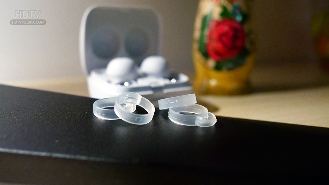 No dobrze, to jak w końcu się je zakłada? Cały trick polega na właściwym umiejscowieniu specjalnej wypustki wystającej z silikonowej wkładki. Całość spoczywa w małżowinie usznej, ale to właśnie ten element gwarantuje stabilne umocowanie słuchawki w uchu. Ta ma kształt ściętej mniej więcej w 1/3 powierzchni kulki – dolna część to pierścień z metalowym elementem w środku, który po wewnętrznej stronie wyposażono w przetworniki. Ten element słuchawki odpowiada za zbieranie dźwięków z otoczenia. W górnej części znajduje się natomiast ta większa “połowa” kulki, która posiada z jednej strony mikrofony, a z drugiej – czujniki odpowiedzialne za identyfikowanie ściągania i zakładania słuchawki. Tu też spoczywa silikonowa obręcz.