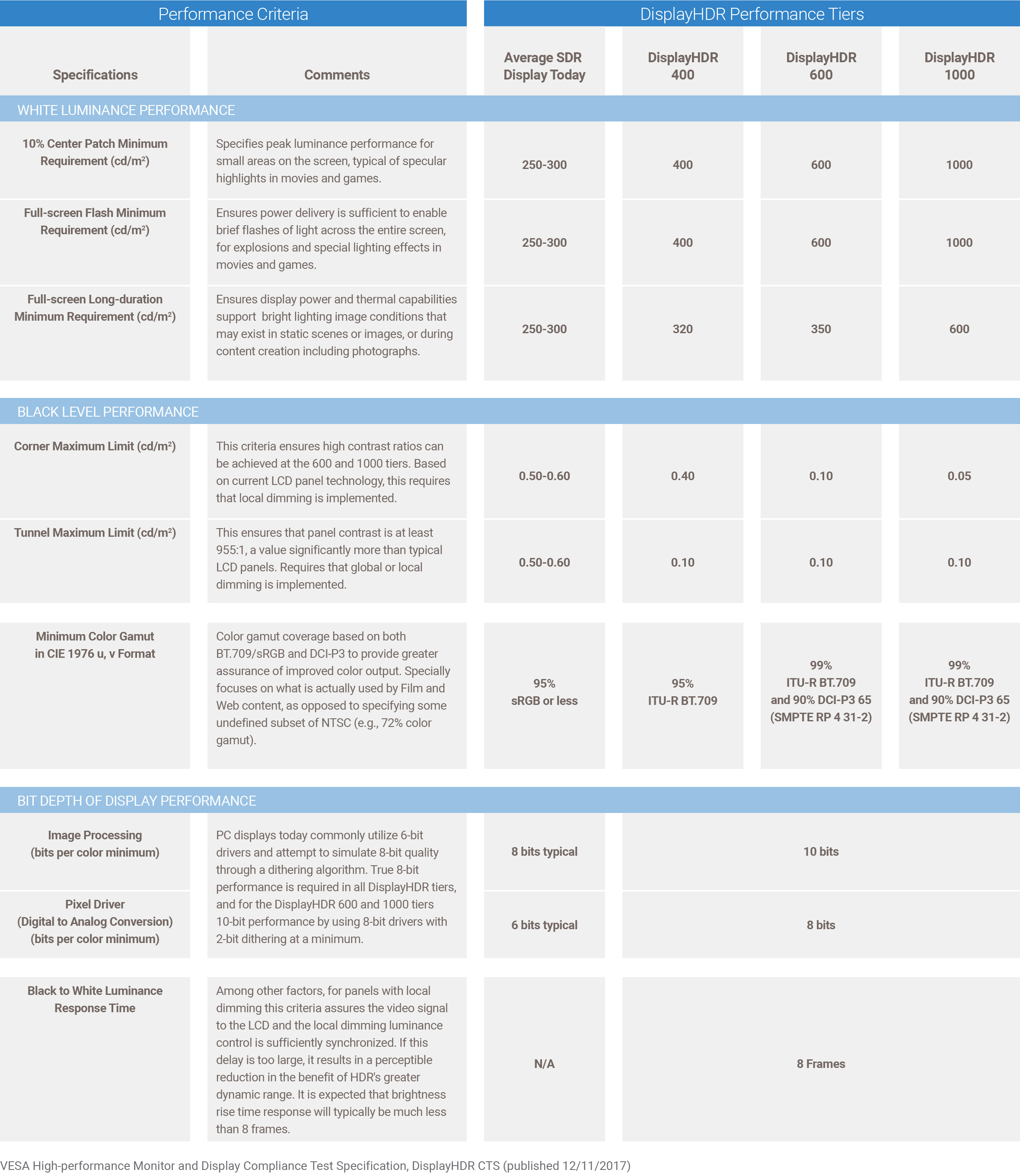 Więcej informacji powinniśmy dowiedzieć się w trakcie CES 2018. Pierwsze monitory z DisplayHDR powinny ukazać się do końca pierwszego kwartału 2018. Poniżej można przejrzeć dokładną tabelę specyfikacji poszczególnych kategorii DisplayHDR (kliknij aby powiększyć):