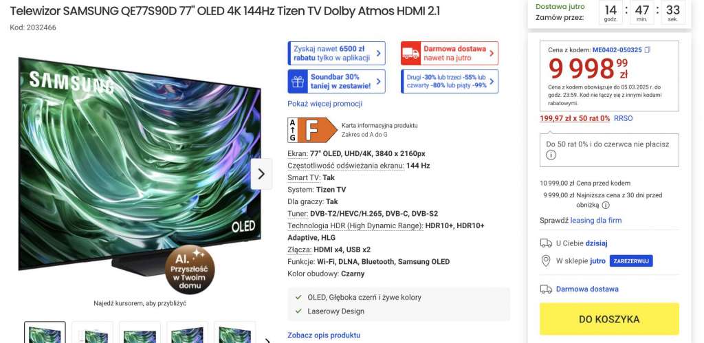 W sieci Media Expert ten aktualny jeszcze telewizor Samsunga kupimy teraz w wariancie 77 cali za 9 998 złotych na mocy kodu rabatowego ME0402-050325 (aktywny do 05.03.2025 r. włącznie). Ale w ratach będzie jeszcze korzystniej – obecnie sklep oferuje do 50 rat 0% z dodatkową możliwością ich odroczenia do czerwca bieżącego roku!