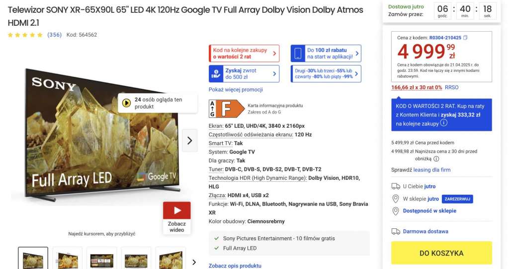 Sony X90L to znakomicie przyjęty przez użytkowników telewizor. Ten model z rocznika 2o23 postawił poprzeczkę bardzo wysoko, osiągając chociażby wyższą aż o 100 nitów jasność w treściach HDR w porównaniu ze swoim poprzednikiem! Z uwagi na matrycę 4K i porty HDMI 2.1 jest to znakomity telewizor do oglądania sportu i grania w gry, ale bez zarzutu sprawdzi się też w filmach i serialach. Teraz w sieci Media Expert ponownie czeka znakomita promocja na wariant z ekranem 65 cali. Z kodem R0304-210425 zapłacimy za niego zaledwie 4 999 zł, co jest najniższą ceną od premiery! Do tego teraz czeka aż 30 rat 0% z opcją odebrania kodu na kolejne zakupy w wysokości dwóch rat (pod warunkiem posiadania profilu klienta).