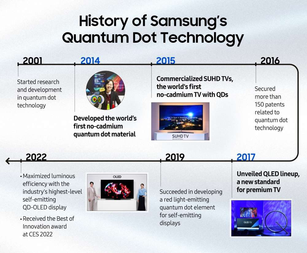Kropki kwantowe przyciągnęły uwagę jako technologia nowej generacji do szerokiego zakresu zastosowań, w tym wyświetlaczy, urządzeń medycznych i ogniw słonecznych. Samsung był w czołówce firm, które najszybciej dostrzegły zalety kropek kwantowych i je wykorzystał. W 2015 roku firma opracowała pierwszy na świecie materiał kropek kwantowych wolny od kadmu i z powodzeniem skomercjalizowała tę technologię w swoich telewizorach SUHD. Kolejno firma nieustannie rozwijała swoją innowacyjną technologię i doskonaliła rozwiązania w zakresie kropek kwantowych, co umożliwiło mu wprowadzenie na rynek – w 2017 roku – telewizorów QLED.