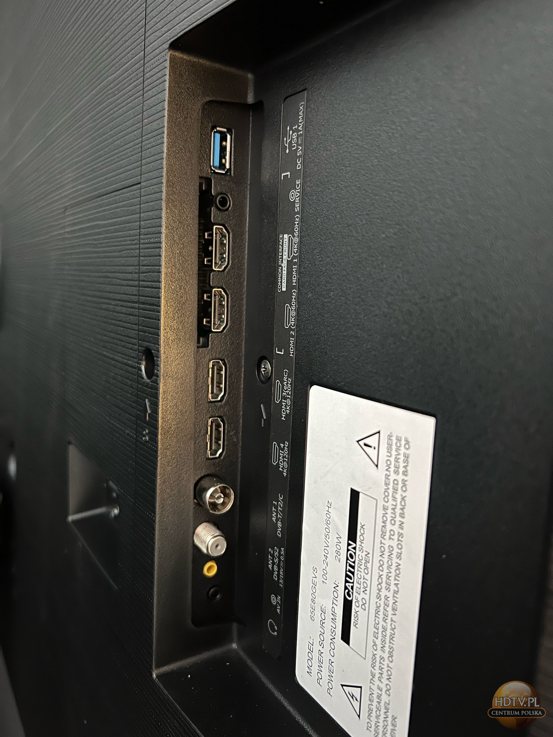 Telewizor posiada 2 porty HDMI 2.1(4K120Hz), 2 porty HDMI 2.0, 2 porty USB, wyjście słuchawkowe, wyjście optyczne (do podłączenie systemu audio), złącze Ethernet oraz tunery telewizyjne. Z pewnością wystarczy nam to na kilka najbliższych lat.