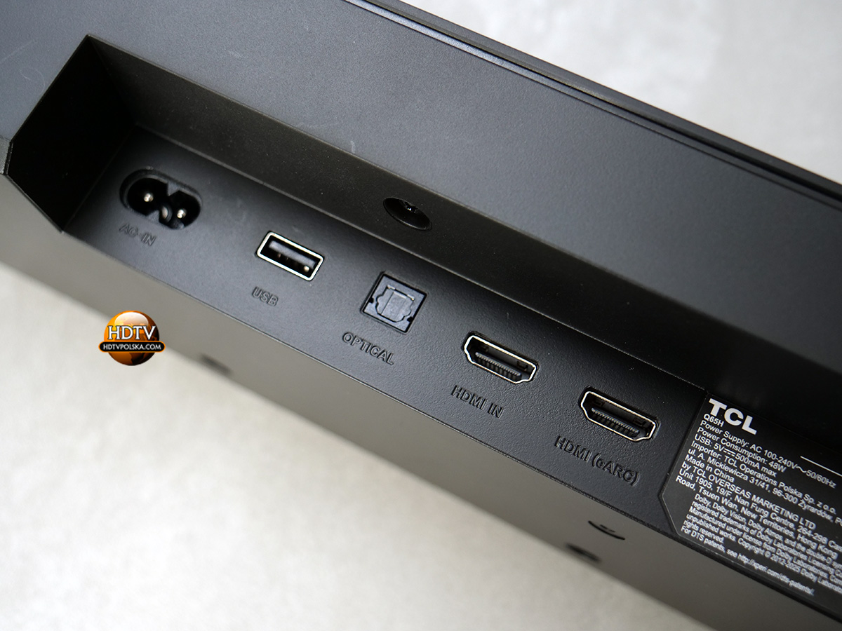 Soundbar TCL Q65H jest dobrze wyposażony pod względem interfejsów: HDMI z obsługą eARC i Passthrough 4K 60 Hz, wejście HDMI z trybami ALLM (Auto Low Latency Mode) i VRR (Variable Refresh Rate). Pozostałe złącza to wejście optyczne Toslink, port Aux 3,5 mm, USB do odtwarzania plików MP3, WMA i FLAC oraz Bluetooth 5.3. Listwa jest kompatybilna z Dolby Vision. Dzięki HDMI-CEC możliwe jest sterowanie soundbarem pilotem telewizora – w praktyce działa to bezbłędnie z modelami TCL i większością urządzeń innych marek.